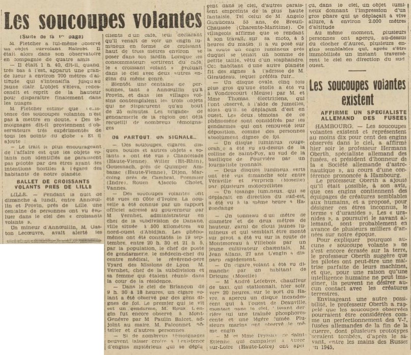 Un mineur d'Annoeuillin, M. Gaston Lecoeuvre, avait alerté les clients d'un café, leur déclarant qu'il venait de voir un engin lumineux en forme de croissant haut de trois mètres environ se poser dans son jardin. Lorsque les consommateurs sortirent du café le "croissant volant" évoluait dans le ciel avec deux autres engins du même genre.