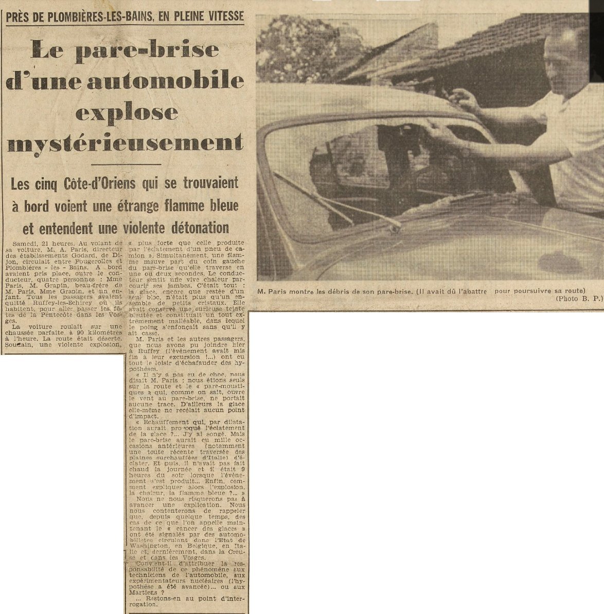 "Echauffements qui, par dilatation aurait provoqué l'éclatement de la glace?... J'y ai songé. Mais le pare-brise aurait eu mille occasions antérieures (notamment une toute récente traversée des plaines surchauffée d'Italie( d'éclater. Et puis, il n'avait pas fait chaud la journée et il était 9 heures du soir lorsque l'événement s'est produit... Enfin, comment expliquer alors l'explosion, la chaleur, la flamme bleue?..."