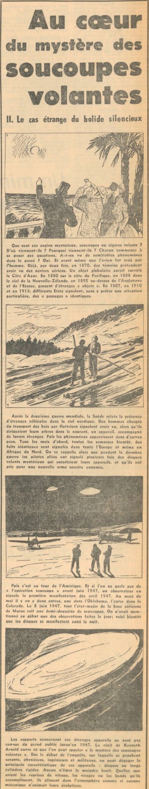 What are these mysterious craft, flying saucers or cigars? Why do they come? Everyone is beginning to ask questions. Were similar phenomena seen in the past? Yes. Even before the airplane was created by man. Already, twice in 1870, witnesses claimed to have seen aerial ships. A globular object is said to have flown over the French Riviera. In 1880 on the Pacific coast, in 1908 in the sky over New Zealand, in 1895 over England and Scotland, strange "objects" were seen. In 1907, 1910, and 1919, various States reported, without paying much attention, similar sightings.
