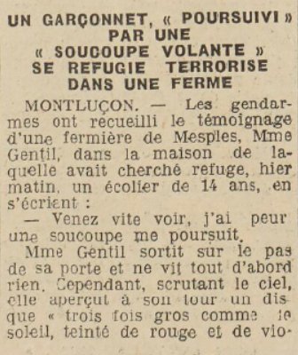 Growing more and more frightened, the schoolboy had the distinct impression that the object was diving toward him. Terrified, he jumped back on his moped, turned around, and headed for Mesples, where he took refuge in the first farmhouse he came across.