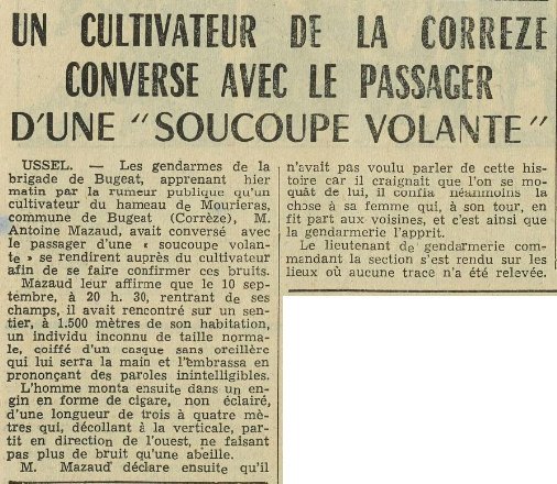 USSEL. -- The gendarmes of the Bugeat brigade, having heard public rumors yesterday morning that a farmer from the hamlet of Mourieras, in the commune of Bugeat (Corrèze), Mr. Antoine Mazaud, had spoken with the passenger of a flying saucer, went to see the farmer to confirm these reports.