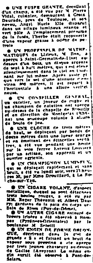 Dans l'Eure à Acquigny, un artisan et son apprenti qui circulent en motocyclette aperçoivent, sur la voie ferrée Evreux-Louviers, un engin en forme de cloche de 3 m à 5 mètres de haut, se trouvant à 1 mètre au-dessus des rails. La partie inférieure de l'engin a la forme d'un anneau.