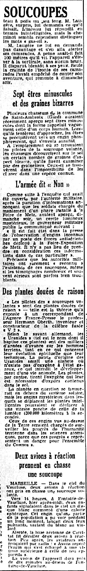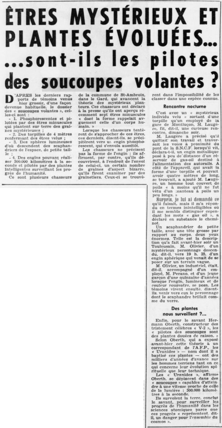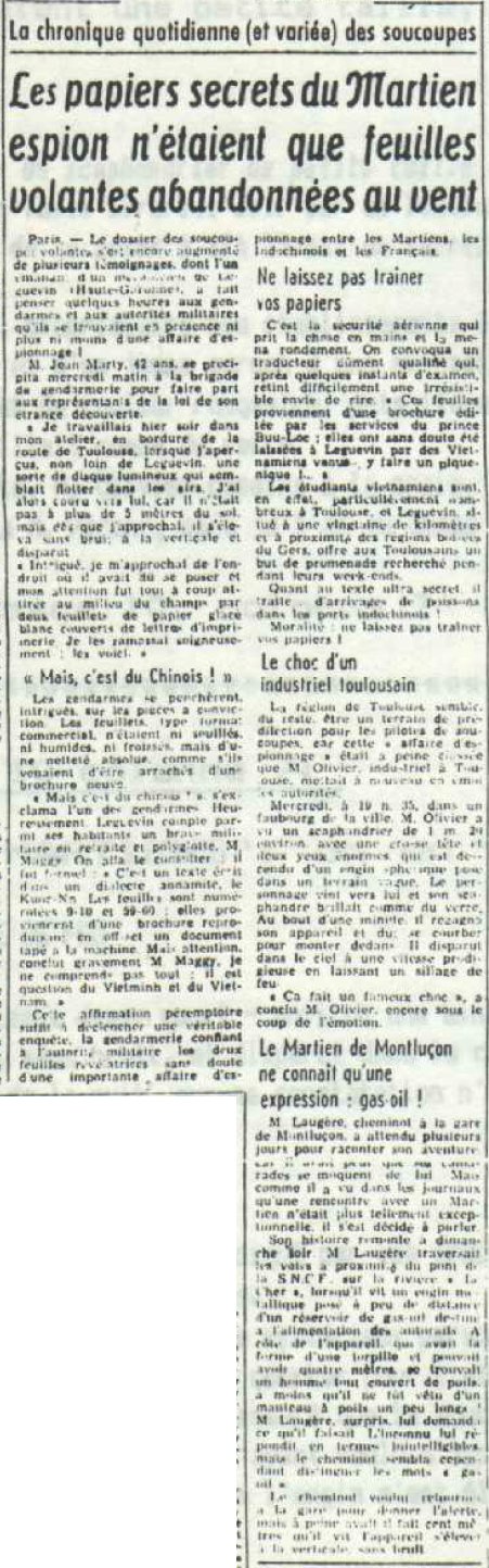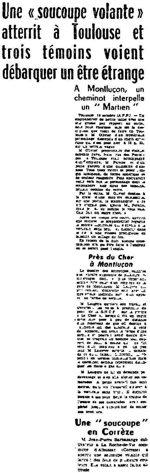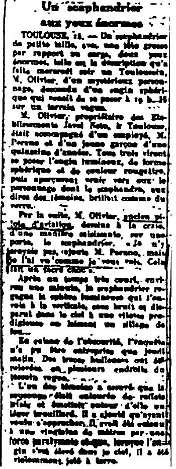 D'autre part, à Toulouse, M. Olivier, propriétaire d'une usine et notabilité locale, déclare avoir vu, l'autre jour, une boule lumineuse posée sur le sol auprès de laquelle se trouvait un petit "Martien" de 1 m. 20 vêtu d'une sorte de scaphandre. Ayant voulu s'approcher du personnage mystérieux, suivi de deux témoins qu'il avait alertés, M. Olivier aurait été retenu à une vingtaine de mètres par une force paralysante. Ensuite le gnôme interplanétaire, que la curiosité des humains devait probablement irriter, pénétra dans sa boule. Celle-ci s'éleva à une vitesse vertigineuse, laissant derrière elle une traînée d'étincelles et sur le sol des traces huileuses. Une enquête est en cours.
