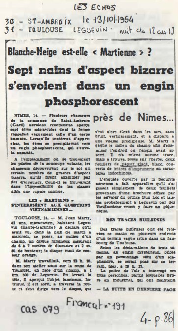 Près de Toulouse, notamment, M. Pierre Vidal et son neveu, Angel Hurlé [sic], ont aperçu, au petit jour, à une centaine de mètres de leur maison, "une fusée géante qui, parti d'un champ, disparut rapidement dans le ciel en produisant une vive clarté". Au sol, l'herbe "avait été tassée sur une surface circulaire ayant 5 mètres de diamètre les quatre empreintes apparaissaient".