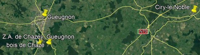 On se réfère souvent au "bois de Chazey" pour cette observation. Ce bois se nomme maintenant (2019) "bois de Chazé", il est au Sud-Est de Gueugnon à côté de la Zone d'Activité de Chazey.