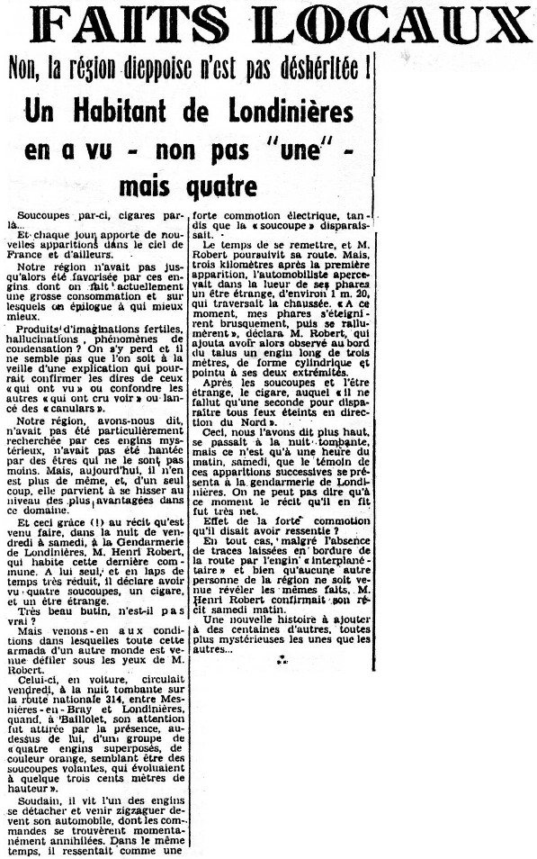 Notre région, avons-nous dit, n'avait pas été particulièrement recherchée par ces engins mystérieux, n'avait pas été hantée par des êtres qui ne le sont pas moins. Mais aujourd'hui il n'en est plus de même et ceci grâce (!) au récit qu'est venu faire, dans la nuit de vendredi à samedi, à la gendarmerie de Londinières, M. Henri robert, qui habite cette dernière commune. A lui seul, et en un laps de temps très réduit, il déclare avoir vu quatre soucoupes, un cigare, et un être étrange.