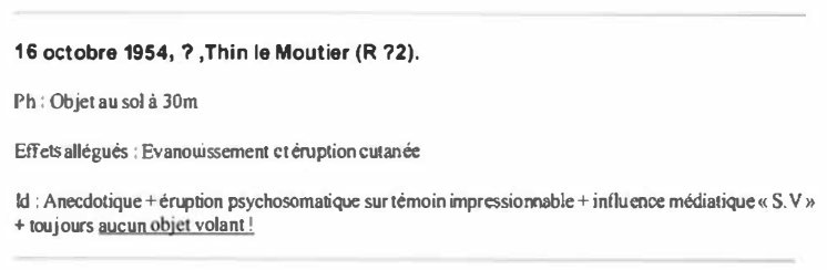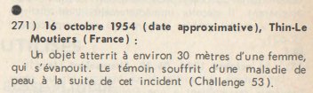 L'ufologue belge indique qu'en 1954, à la date approximative du 16 octobre en France à Thin-Le Moutiers, Ardennes, "Un objet atterrit à environ 30 m d'une femme qui s'évanouit. Le témoin souffrit d'une maladie de peau à la suite de cet incident."