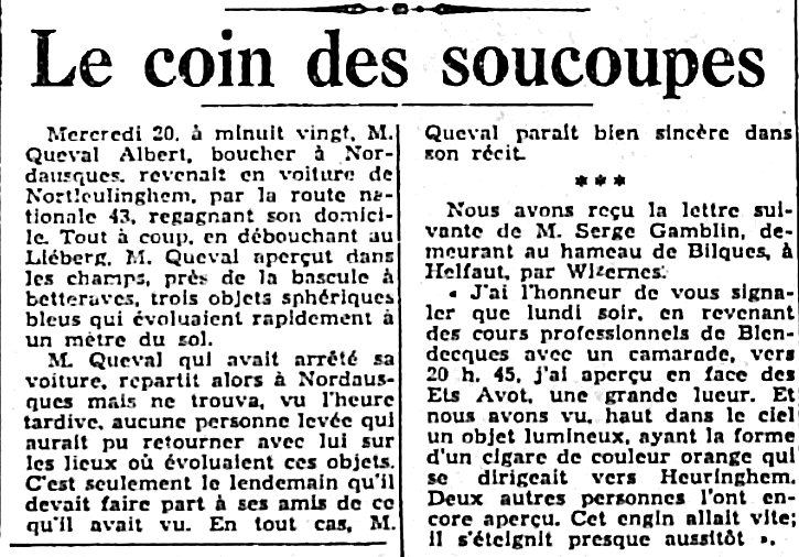 Mercredi 20, à minuit vingt, M. Queval Albert, boucher à Nordausques, revenait en voiture de Nortleulinghem, par la route nationale 43, regagnant son domicile. Tout à coup, en débouchant au Liéberg, M. Queval aperçut dans les champs, près de la bascule à betterave, trois objets sphériques bleus qui évoluaient rapidement à un mètre du sol.