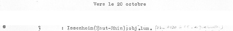 20 octobre 1954 (vers): Issenheim (sur Rte.Nale.83, à 3 m AVDO à l'ESE de Guebwiller--Haut-Rhin):(atteriss. [sic] eng.lumin.) (date à préciser aveccertitude)