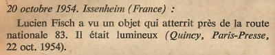 L'auteur indique que le 20 octobre 1954, Mr. Lucien Fisch a vu atterrir un objet lumineux à Issenheim, près de Guebwiller dans le Haut-Rhin.