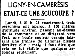 The regional newspaper La Voix du Nord, in the local issue of Cambrai for October 21, 1954, reported that "Monday" - therefore October 18, 1954 - "at 9:05 p.m. exactly", three people had seen, "at an altitude of about 150 meters, passing over the town and heading east, an orange ball leaving a trail of blue flames behind; but it must be said that this was only visible for a few seconds."