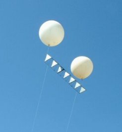 Même sans erreur de date, la possibilité de ballons demeure; je pense à un dispositif de type ballons en tandem, reliés par un câble portant la radiosonde, ou reliés par quelque autre dispositif, tel que visible ci-dessous. Je précise que ces allons tandems ne sont pas de 1954; mais on ne peut pas exclure une telle explication pour cette observation, notamment parce que la durée de la "disparition" derrière l'horizon n'a pas été donnée.