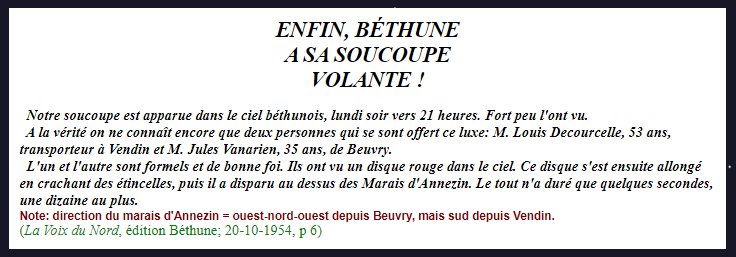 Le journal régional Nord-Eclair, de Roubaix, rapportait le 20 octobre 1954, que la nouvelle avait couru comme une traînée de poudre la veille qu'entre autres, un homme de Vendin-lez-Béthune, M. Louis Decourcelle, 54 ans, transporteur, rue de la Mairie, avait vu pendant quelques secondes, "un disque de feu semblable à la pleine lune... qui s'allongea soudain par la base, comme un ballon de rugby, prit ensuite la couleur indigo, puis s'éloigna vers le sud-ouest de Béthune (vers Annezin), en traçant une traînée d'étincelles".