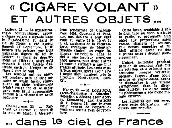 Le journal régional L'Indépendant rapportait le 22 septembre 1954, plusieurs observations, dont celle du "mystérieux engin communément appelé 'Cigare volant', signalé dans le Puy de Dôme et dans le ciel de Rome", que le journal dit avoir été aperçu samedi 18 septembre à 19 heures très précises, par trois habitants dignes de foi de Lodève, au Nord du département de l'Hérault, alors qu'il évoluait à 1.500 mètres d'altitude environ", se dirigeant vers le Sud.