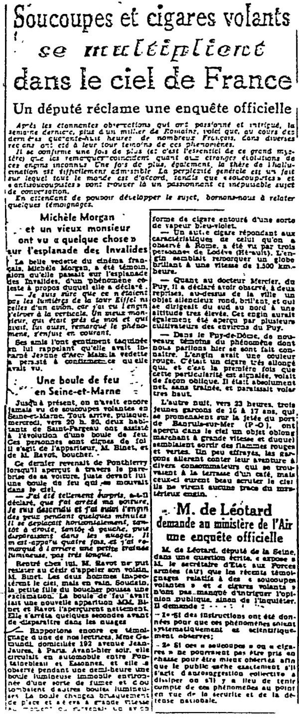 La célèbre actrice Michèle Morgan, elle-même, a remarqué au-dessus de l'esplanade des Invalides deux "globes lumineux" dont elle affirme qu'ils n'étaient ni une illusion d'optique, ni un engin de type connu.