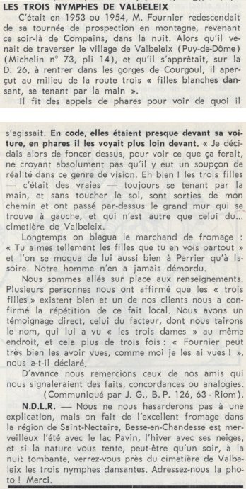 LDLN's editors concluded: "We won't venture an explanation, but excellent cheese is made in the region of Saint-Nectaire, Besse-en-Chandesse is wonderful in summer with Lake Pavin, winter with its snows, and if nature tempts you, perhaps one evening, at nightfall, you will see the three dancing nymphs near the Valbeleix cemetery. Send us the photo! Thank you."