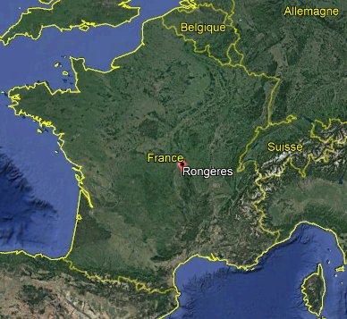 Juste au nord de Vichy et approximativement au centre de la France se trouve le village de Rongers [sic] où un OVNI elliptique brillant a traversé le ciel à 4h30 l'après-midi du 19 septembre. Un deuxième OVNI a rapidement suivi le premier, filant directement au-dessus de la tête, l'objet a clairement révélé son contour circulaire. Au lieu d'ignorer le village comme l'OVNI précédent, cet objet a freiné jusqu'à s'arrêter, a fait une grande orbite autour de la communauté, puis est rapidement parti en direction du sud-est.