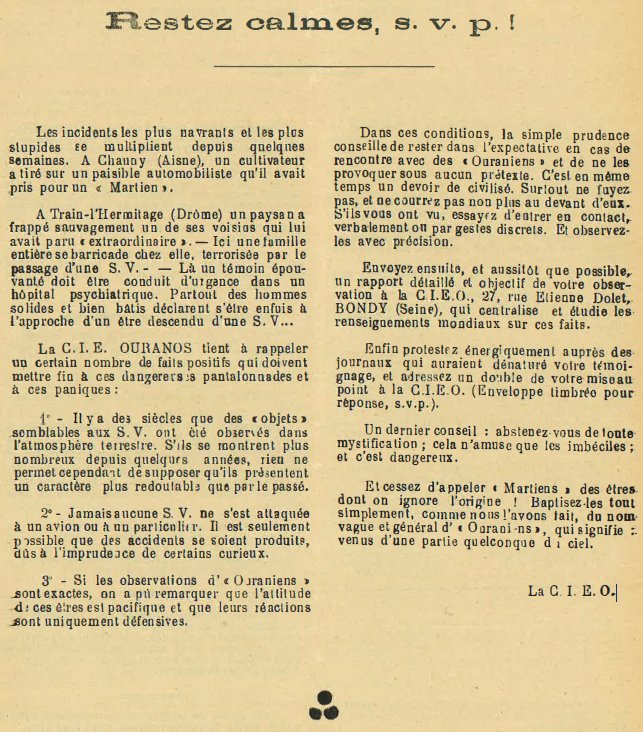Envoyez ensuite, et aussitôt que possible, un rapport détaillé et objectif de votre observation à la C.I.E.O., 27, rue Etienne Dolet, BONDY (Seine), qui centralise et étudie les renseignements mondiaux sur ces faits.