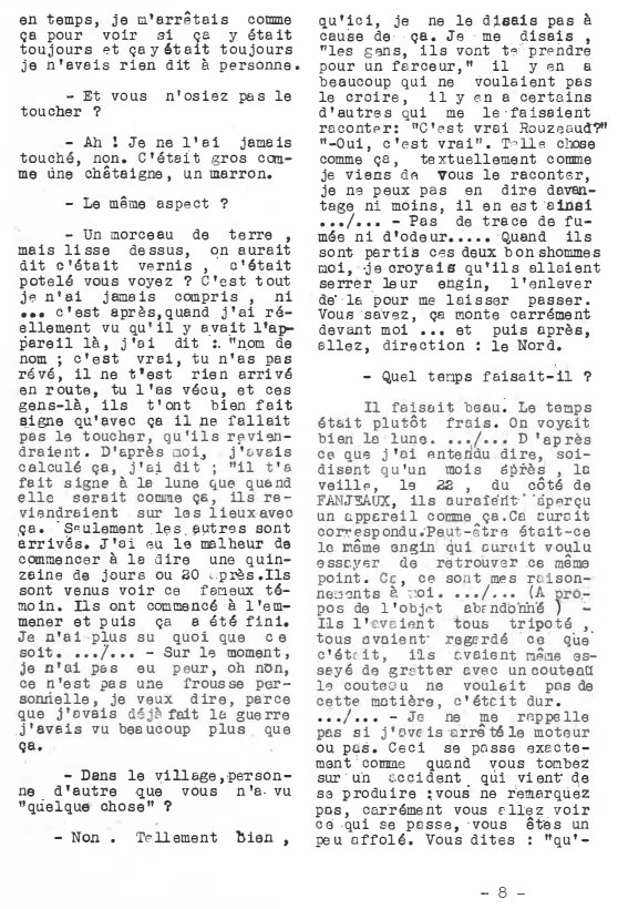 Il faisait beau. Le temps était plutôt frais. On voyait bien la lune .../... D'après ce que j'ai entendu dire, soi-disant qu'un mois après, la veille, le 22, du côté de FANJEAUX, ils auraient aperçu un appareil comme ça. Ca aurait correspondu. Peut-être était-ce le même engin qui aurait voulu essayer de retrouver ce même point. Ca, ce sont mes raisonnements à moi .../... (A propos de l'objet abandonné) - Ils l'avaient tuus tripoté, tous avaient regardé ce que c'était, ils avaient même essayé de gratter avec un couteau le couteau ne voulait pas de cette matière, c'était dur. .../... - Je ne me rappelle pas si j'avais arrêté le moteur ou pas. Ceci se passe exactement comme quand vous tombez sur un accident qui vient de se produire: vous ne remarquez pas, carrément vous allez voir ce qui se passe, vous êtes un peu affolé. Vous dites: "qu'-
