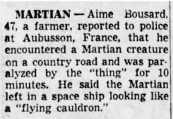 MARTIEN -- Aime Bousard, 47 ans, un fermier, a rapporté à la police à Aubusson, France, qu'il a rencontré une créature Martienne sur une route de campagne et a été paralysé par la "chose" pendant 10 minutes. Il a dit que le Martien est parti dans un vaisseau spatial qui ressemblait à un "chaudron volant."