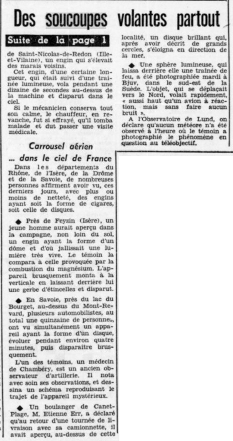Ce n'est plus une épidémie, c'est une véritable invasion de soucoupes, pour la seule journée d'hier on en a signalé dans le Rhône, l'Isère, la Drôme, la Savoie. Ceci pour la France, car l'étranger n'est pas épargné par cette étrange maladie. C'est ainsi qu'en Suède, un cinéaste amateur a filmé une sphère lumineuse qui laissait derrière elle une longue traînée de feu. A la vérité cette soucoupe volait si haut et si vite que le cinéaste dut utiliser un téléobjectif. Le film développé a été projeté en présence d'un certain nombre d'experts, qui ont déclaré avec ensemble: qu'à la vérité on ne voyait pas grand-chose, mais que cela tenait peut-être la mauvaise visibilité.