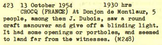 *13 oct. 1954 - Trois heures plus tard à 19h30 à Crocq, en France, à Donjon de Montlaur, J. Dubois et quatre autres témoins ont vu manoeuvrer un engin rond, dégageant une lumière aveuglante. Il avait quelques ouvertures ou hublots, et semblait descendre et atterrir loin d'eux. (Source: Jacques Vallee, Passport to Magonia, p. 227, cas n° 248).