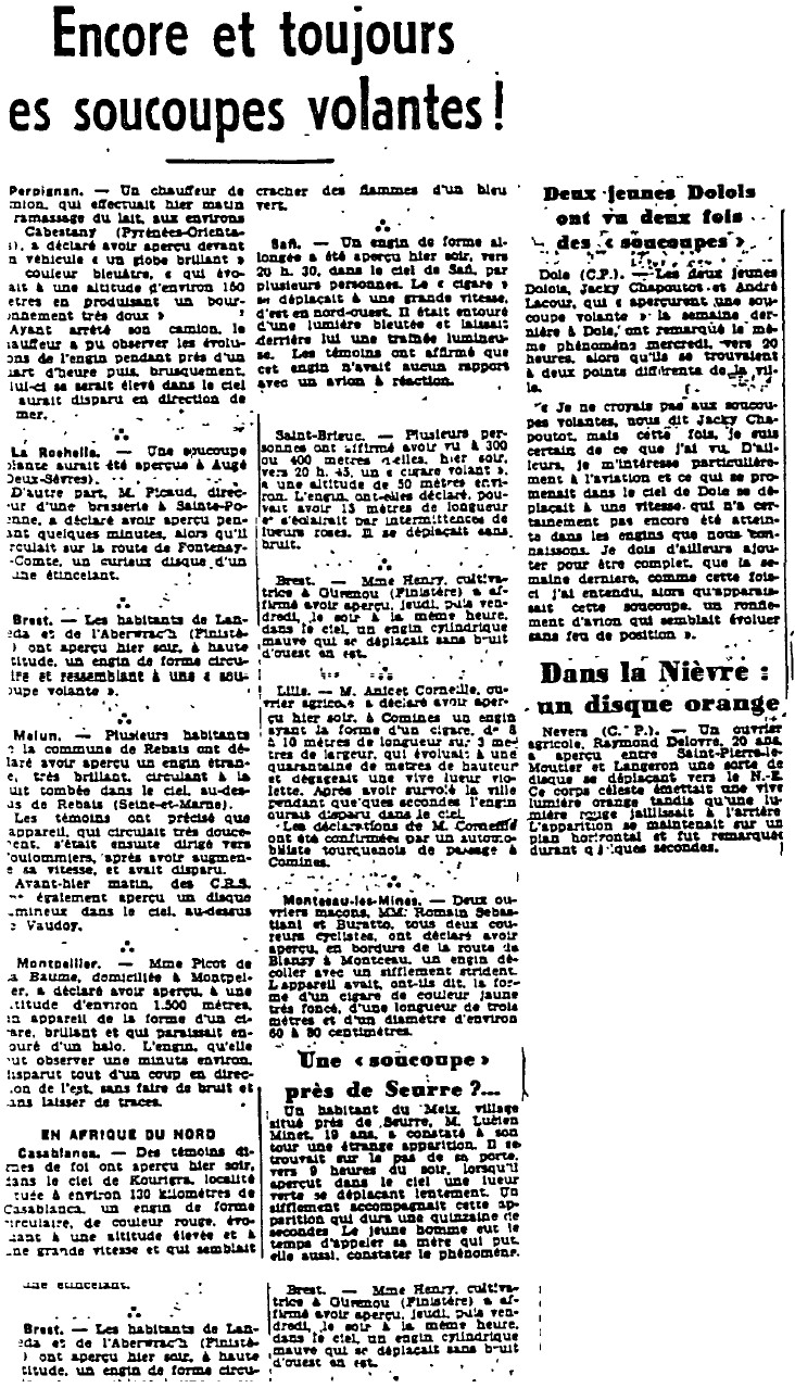 Nevers (C.P.). -- Un ouvrier agricole, Raymond Delovre, 20 ans, a aperçu entre Saint-Pierre-le-Moutier et Langeron une sorte de disque se déplaçant vers le N.-E. Ce corps céleste émettait une vive lumière orange tandis qu'une lumière jaune jaillissait à l'arrière. L'apparition se maintenait sur un plan horizontal et fut remarquée durant quelques secondes.