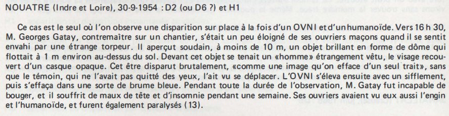 September 30 [, 1954]: near Marcilly-sur-Vienne, in the department of Indre-et-Loire, Georges Gatay, construction site foreman, and seven workers see a disc at ground level and a small humanoid wearing a helmet. The disc and the humanoid disappear in a very strange manner2.