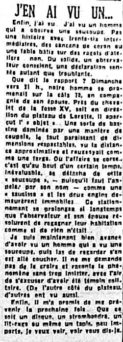In the regional newspaper La Croix du Nord, local edition of Arras and Béthune, Pas-de-Calais, for October 6, 1954, a journalist proudly announces that he has seen.. a man who saw a flying saucer.