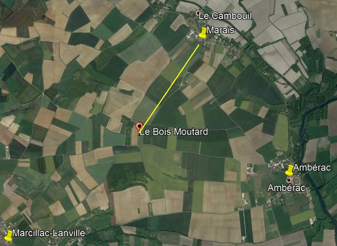 Du centre d'Ambérac à la direction du centre de Marcillac-Blanville, on a un cap de 257°, ce qui est assez proche de celui de la lune. Mais le témoin est au hameau le Marais - chez lui au lieu dit "Le Cambouil" - quand il prévent "des voisins", le cap est alors 223° (Sud-Est). Ce qui est encore plus proche de la position de la Lune.