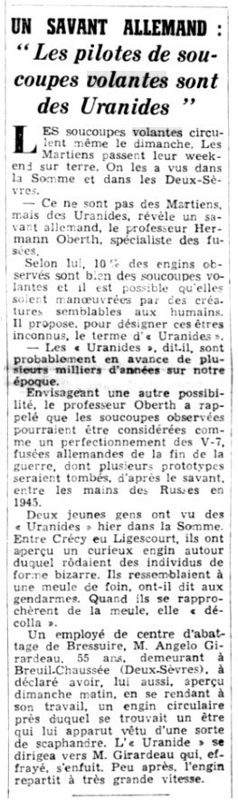 Le professeur Oberth a ajouté qu'il est possible à son avis, que ces engins contiennent des équipages de créatures semblables aux humains, et a proposé, pour désigner ces êtres inconnus, le terme "Uranides". Les "Uranides", a poursuivi le savant allemand, sont probablement en avance de plusieurs milliers d'années sur notre époque.