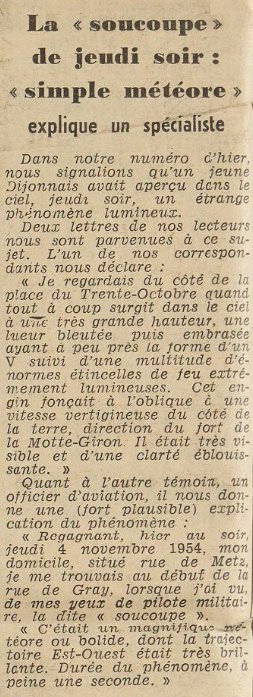 Le 5 novembre 1954, le journal Le Bien Public de Dijon signalait qu'un enfant de 12 ans à Dijon avait vu la veille vers 19h30, "un étrange phénomène: une lueur gris bleu se déplaçant dans le ciel. Au vu de cette étrange manifestation, l'enfant, qui se trouvait rue du Palais où demeurent ses parents, prit peur et se précipité [sic] à l'abri du toit paternel."