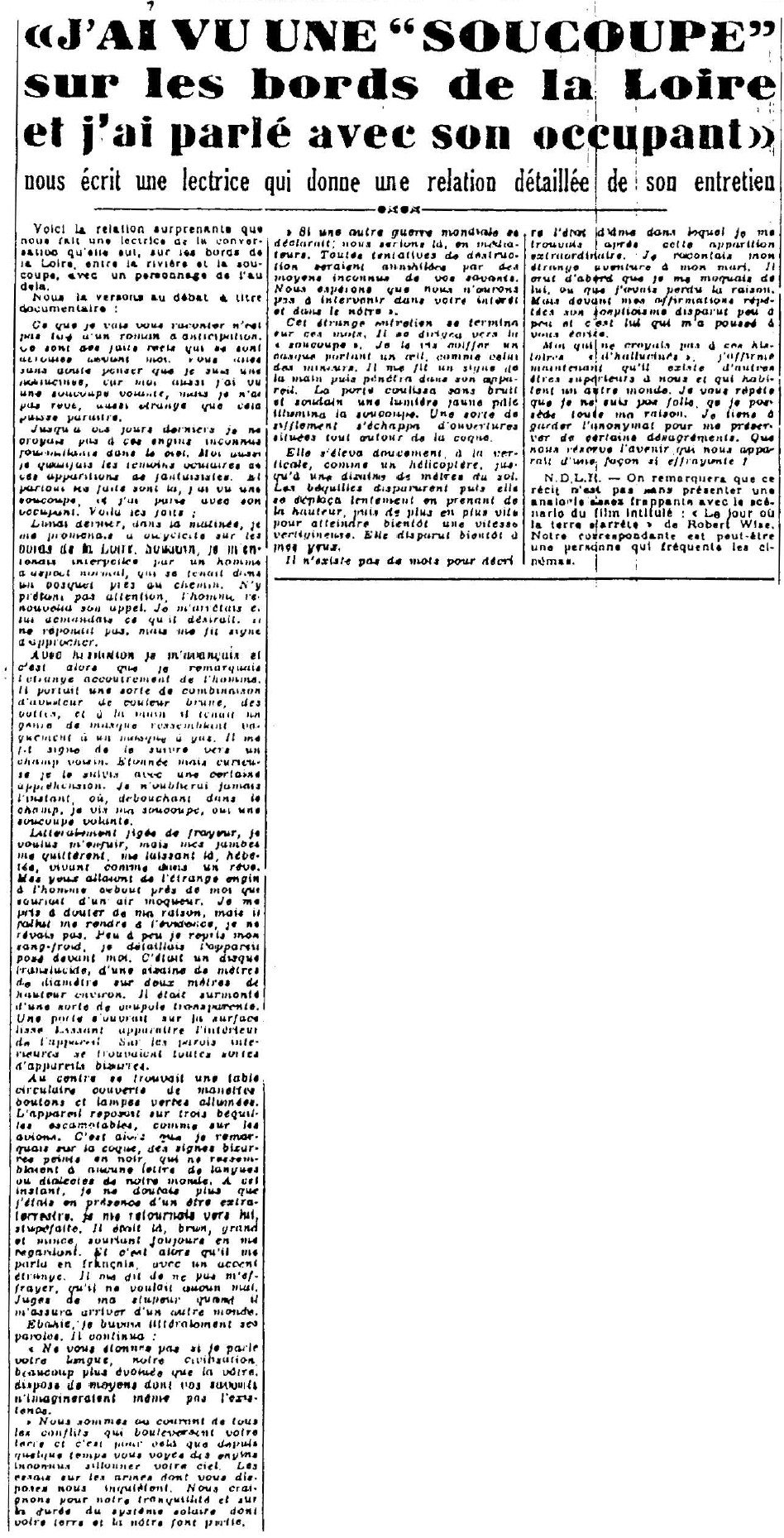 Lundi dernier, dans la matinée, je me promenais à bicyclette sur les bords de la Loire. Soudain, je m'entendis interpellée par un homme d'aspect normal qui se tenait dans un bosquet, près du chemin. N'y prêtant pas attention, l'homme renouvela son appel. Je m'arrêtai et lui demandai ce qu'il désirait. Il ne répondit pas, mais me fit signe d'approcher. Avec hésitation je m'avançai et c'est alors que je remarquai l'étrange accoutrement de l'homme. Il portait une combinaison d'aviateur de couleur brune, des bottes, et à la main il tenait un genre de masque ressemblant vaguement à un masque à gaz. Il me fit signe de le suivre dans un champ voisin. Etonnée mais curieuse, je le suivis avec une certaine appréhension. Je n'oublierai jamais l'instant où, débouchant dans le champ, je vis sa soucoupe, oui, une soucoupe volante.