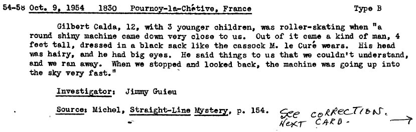 Quatre enfants: Gilbert Calda, douze ans, Daniel Hirsch, neuf ans, J-P. Hirsch, cinq ans, et Robert Maguin, seize ans, faisaient du patin à roulettes, quand ils virent un objet lumineux près du cimetière. Il était rond, d'un diamètre de 2,50 m environ et était posé sur trois béquilles. Un nain, d'environ 1,20 m, vêtu en noir, le visage couvert de poils, de gros yeux, en sortit et dirigeant sur eux une lumière aveuglante, prononça quelques mots dans un langage inconnu. Les enfants s'enfuirent et se retournèrent à temps pour voir l'objet s'envoler haut dans le ciel (P. 49, M. 154)