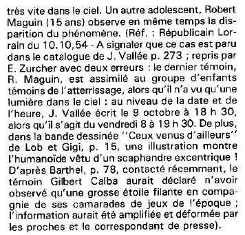 A l'époque, la vue d'un occupant avait été "expliquée" par la présence d'un habitant du pays qui ramassait de l'herbe pour ses lapins en se servant d'une torche électrique, ce qui aurait trompé les enfants, dont le plus âgé avait 12 ans. Gilbert Calba, pour sa part, refusa tout d'abord d'admettre avoir vu quoi que ce soit, puis devant mon insistance, admit avoir aperçu une source lumineuse mobile dans le ciel qu'il ne put identifier. Au fur et à mesure que je lui posais des questions, à sa façon quelque peu maladroite de fuir les réponses, je compris que cet homme était victime d'un blocage psychologique. Puis, quelques jours plus tard, j'exhumai un article publié dans Le Lorrain du 11 octobre 1954, page 5, qui relate comment le père de Gilbert lui administra une correction pour avoir eu l'audace de narrer son observation à qui voulait bien l'entendre. Jean-Pierre Hirsch me précisa que les gens du village les tournèrent en ridicule, ce qui dut marquer plus fortement Gilbert Calba, qui était le "chef" de la bande, en tant qu'aîné. Imaginez un habitant pris pour un "ufonaute", une correction, plus les quolibets des voisins, et pensez au résultat que cela peut donner sur le mental d'un gosse de 12 ans. Il se bloque, et on n'arrive plus à tirer de lui, même devenu adulte, une relation correcte des faits car son psychisme a été modifié en profondeur.