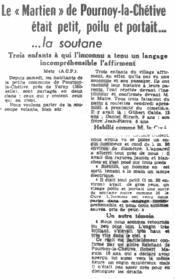 Nous faisions du patin à roulettes, racontent les enfants (Gilbert Calda, douze ans, Daniel Hirsch, neuf ans, et son frère Jean-Pierre, cinq ans), lorsqu'une machine brillante et ronde se posa tout près de nous. Une espèce d'homme haut de 1 m, 20 en est sorti, habillé dans un sac noir ressemblant à la soutane de M. le curé. Il avait une tête poilue et de gros yeux. Il nous a dit des choses que nous n'avons pas comprises et nous nous sommes enfuis. Un peu plus loin, nous nous sommes arrêtés pour regarder. La machine remontait dans le ciel à toute allure.