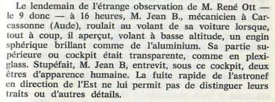 Un mécanicien de Carcassonne, M. Bertrand, a vu, samedi soir également, sur la route, alors qu'il circulait en voiture, un engin sphérique de métal brillant dont la partie supérieure semblait être en matière plastique. Il a pu, dit-il, facilement distinguer deux formes humaines dans cet appareil, qui a disparu à une grande vitesse dans la direction est.