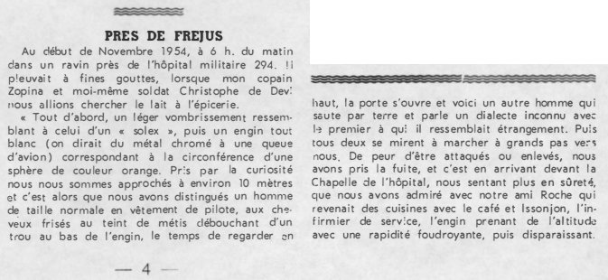 Les deux auteurs se réfèrent à Lumières Dans La Nuit N° 87 pour indiquer qu'au début de novembre 1954, à 6 heures du matin près de Fréjus, sous une pluie à fines gouttes, les soldats Christophe de Devi et Zopina allaient chercher du lait à une épicerie et se trouvaient dans un ravin près de l'hôpital militaire 294, quand ils ont entendu un vrombissement qui ressemblait à celui d'une mobylette "Solex", puis ont vu un engin posé au sol.