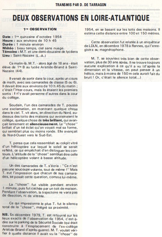 Cette observation fut relatée à un enquêteur de LDLN, en décembre 1978 à Rennes, qui l'enregistra au magnétophone.