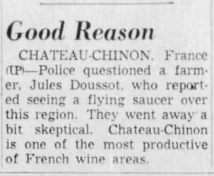 2 sept. La police a interrogé un fermier, Jules Doussot, qui a rapporté avoir vu une soucoupe volante au-dessus de cette région. Ils sont repartis un peu sceptiques. Château-Chinon est l'une des régions viticoles françaises les plus productives.
