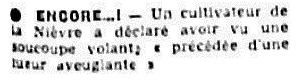 Nevers (de notre C.P.). -- Près de Saint-Hylaire-en-Morvan [sic], un cultivateur, M. Julien Doussot, sortant de chez lui, aperçut dans le ciel une sorte de flamme incandescente. Celle-ci répandait une lueur très blanche et scintillante. L'engin qui se dirigeait sans aucun bruit, en direction de Châtel-Guyon, disparut entre deux montagnes.