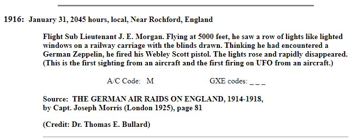 1916 Jan 31, 2045 hours, local, Near Rochford, England, Flight Sub Lieutenant J. E. Morgan. Flying at 5000 feet, he saw a row of lights like lighted windows on a railway carriage with the blinds drawn. Thinking he had encountered a German Zeppelin, he fired his Webley Scott pistol. The light rose and rapidly disappeared. (First sighting from an aircraft, first firing on UFO from an aircraft.)