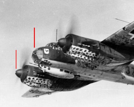 L'avion est certainement un bimoteur, mais ne peut pas être un Junkers Ju-88 parce que, comme le montre la photo ci-dessous, la position de l'équipage, y compris la pls avancée, dans le nez, y est telle que le moteur sur l'aile apparaîtrait bien plus sur la photo. Il serait possible que ce soit une photo prise depuis un autre avion, qui aurait ensuite été fortement recadrée. Dans ce cas le récit serait évidemment faux puisqu'il n'implique qu'un seul avion.