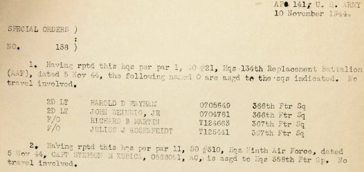 Dans diverses sources historiques, j'ai pu découvrir que Richard B. Martin, de Hartford, Connecticut, Etats-Unis, a rejoint le 367th Fighter Squadron le 10 novembre 1944. Le 12 avril 1945, il avait été promu sous-lieutenant.