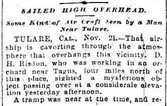 SAILED HIGH OVERHEADSome kind of Air Craft Seen by a Man near Tulare TULARE, Cal., Nov 21. -- That airship is cavorting through the atmosphere that overhangs this vicinity. D.H. Risdon, who was working in an orchard near Tagus, four miles north of this place, sighted a mysterious object passing over at a considerable elevation yesterday afternoon. A tramp was near at the time, and remarked that he never saw a balloon sail against the wind. But while the object overhead seemed to be sailing into the teeth of the wind, it may have found an opposite current in an upper stratum. It was passing to the northwest and Risdon declares it was like an immense sheet spread out in the air. It soon passed out of sight. Risdon had not previously read or heard of the strange visitor said to have been seen at Sacramento, and as his reputation for veracity is excellent, his story is generally believed. [scf1] [sdr1] |