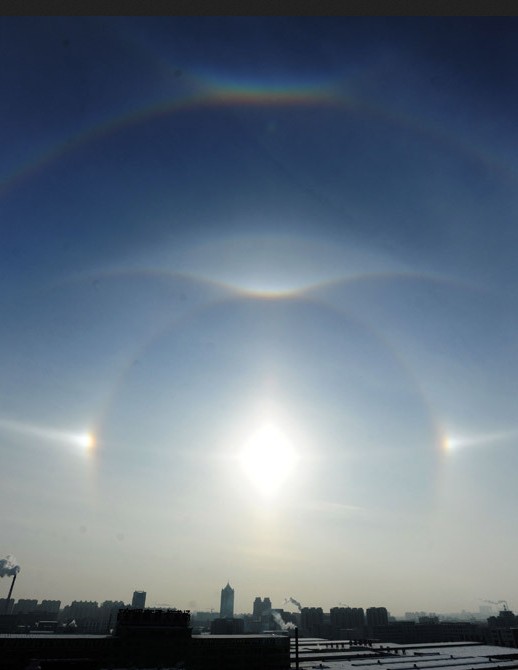 Un parhélie, du grec ancien "para", "près de" et "hélios", le soleil, est un phénomène visible à l'oeil dans lequel de deux répliques de l'image du soleil sont vues horizontalement de part et d'autre de celui-ci avec souvent un halo circulaire (photos ci-dessous). Il est souvent décrit dans les anciennes chronique comme apparition de "trois soleils".