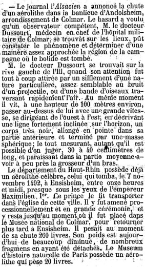 Le journal l'Alsacien a annoncé la chute d'un aérolithe dans la banlieue d'Andolsheim, arrondissement de Colmar. Le hasard a voulu qu'un observateur compétent, M. le docteur Dussourt, médecin en chef de l'hôpital militaire de Colmar, se trouvât sur les lieux, pût constater le phénomène et déterminer d'une manière assez approchée la région de la campagne où le bolide est tombé.