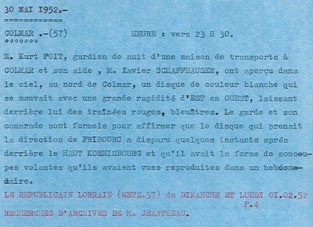 Hier soir vers 23h30, M. KURT FOIT, gardien de nuit d'une maison de transport à COLMAR, et son aide M. Xavier SHAFFHAUSER, ont aperçu, dans le ciel au Nord de COLMAR, un disque de couleur blanche qui se mouvait avec une très grande rapidité d'E en O, laissant derrière lui des trainées rouge bleuâtres. Le garde et son camarade sont formels pour affirmer que le disque qui prenait la direction de FRIBOURG * a disparu quelques instants après, derrière le HAUT KOENIGSBOURG ** et qu'il avait la forme de soucoupe qu'ils avaient vu reproduite dans un hebdomadaire.