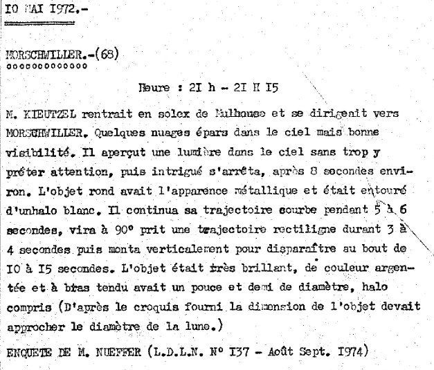 Le mercredi 10 mai 1972, vers 21 hl, un vélomotoriste roulant de Mulhouse vers Morschwiller (68) aperçoit une lumière dans le ciel. Un objet rond d'apparence métallique entouré d'un halot [sic] blanc effectue un parcours compliqué avant de monter verticalement pour disparaitre.