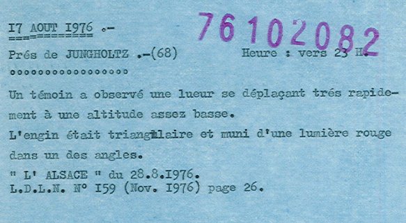 Le mardi 17 août, vers 23 h (TU: 21h), une habitante de Riedisheim traversant en voiture la localité de Jungholtz (68) aperçoit une lueur se déplacer à vive allure très bas dans le ciel. De forme triangulaire, le phénomène porte une lumière rouge dans un angle.